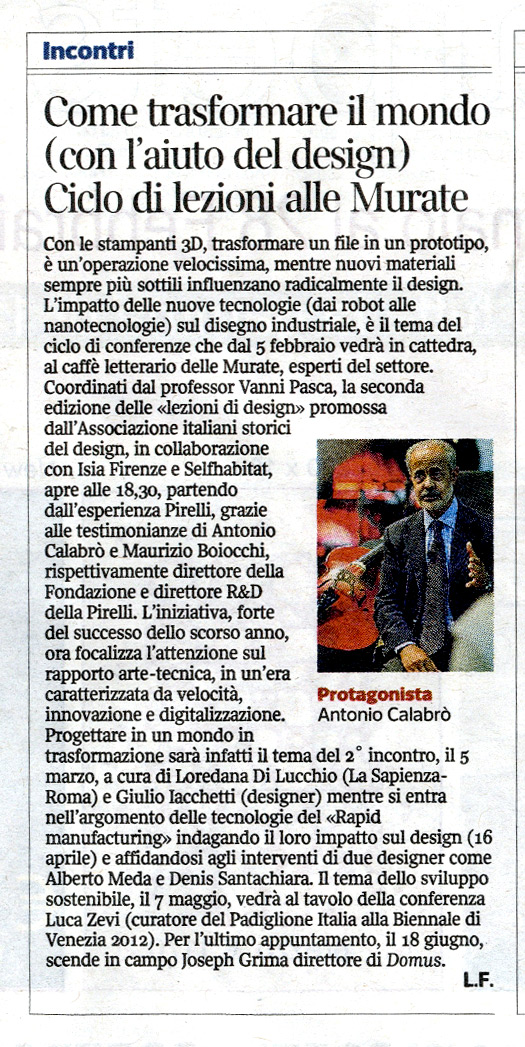 La rassegna stampa della seconda edizione delle Lezioni di design: un ciclo di conferenze aperte sui grandi temi del design organizzato dall’ISIA di Firenze insieme a A/I/S/Design Associazione italiana storici del design, Selfhabitat e in collaborazione con Otto e Le Murate Caffè Letterario. L’iniziativa è patrocinata da ADI e AIAP.