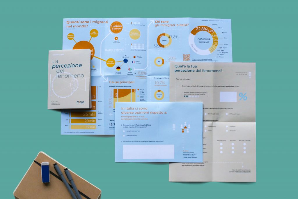 La campagna Occhio ai dati, Immigrazione in Italia tra realtà e percezione, persegue questi obiettivi portando una selezione di dati attendibili nelle scuole, per fornire agli studenti e alla comunità educante, un grado oggettivo di conoscenze rispetto a un fenomeno sociale divisivo e polarizzante. Nello specifico il progetto tratta il tema del divario tra realtà e percezione, integrando a questo macro-tema altri collegamenti di approfondimento. La campagna è stata sviluppata tramite gli strumenti del graphic e del service design, andando a progettare la struttura di un incontro laboratoriale e gli elaborati grafici necessari per la sua attuazione. La comunicazione perseguita dalla campagna è resa possibile dall’interazione con gli studenti, il cui coinvolgimento avviene tramite fasi di dibattito, scoperta della realtà, generazione e visualizzazione di dati. Le varie attività dell’incontro seguono le fasi di apertura di due mappe tematiche, e alternano modalità di interazione individuali, di gruppo e di classe.