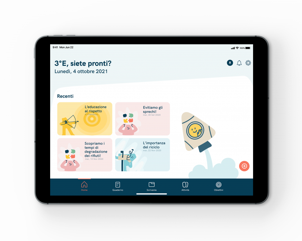 Le quattro sezioni, si trovano all’interno di una homepage nella quale gli insegnanti, oltre ad avere accesso alle diverse aree dell’applicazione, possono impostare file come elementi fissi all’interno della pagine, avere accesso diretto ai contenuti utilizzati nelle lezioni precedenti e vedere le notifiche di altri colleghi.